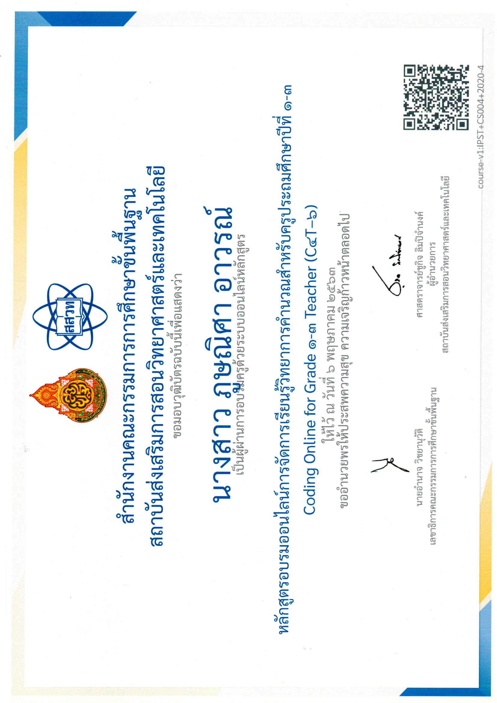 ชื่อผลงาน : ปี 2563 ผ่านการอบรมครูด้วยระบบออนไลน์หลักสูตร อบรมออนไลน์การจัดการเรียนรู้วิทยาการคำนวณสำหรับครูประถมศึกษาปีที่ 1-3 ของ (สพฐและ สสวท)