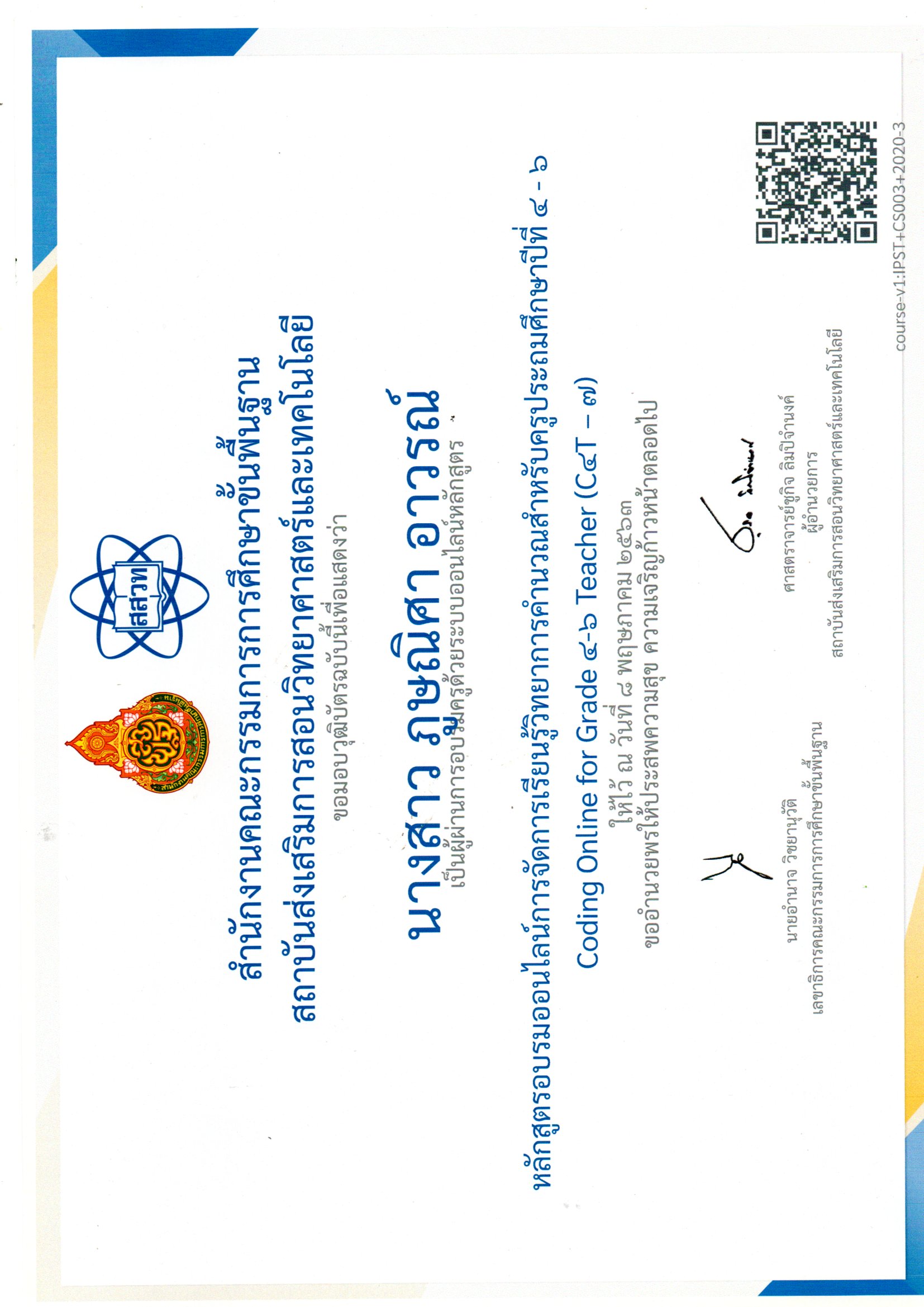 ชื่อผลงาน : ปี 2563 ผ่านการอบรมครูด้วยระบบออนไลน์หลักสูตร อบรมออนไลน์การจัดการเรียนรู้วิทยาการคำนวณสำหรับครูประถมศึกษาปีที่ 4-6 ของ (สพฐและ สสวท)