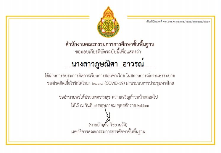ชื่อผลงาน : ปี 2563 ผ่านการอบรมการจัดการเรียนการสอนทางไกล ในสถานการณ์การแพร่ระบาดของโรคติดต่อไวรัสดคโรนา (2019)(COVID-19)ผ่านระบบการประชุมทางไกล