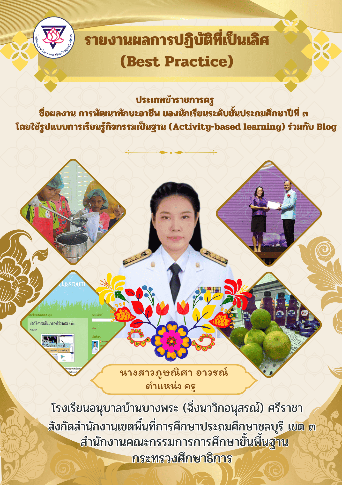 ชื่อผลงาน : Best Practice การพัฒนาทักษะอาชีพ ของนักเรียนระดับชั้นประถมศึกษาปีที่ ๓ โดยใช้รูปแบบการเรียนรู้กิจกรรมเป็นฐาน (Activity-based learning) ร่วมกับ Blog
